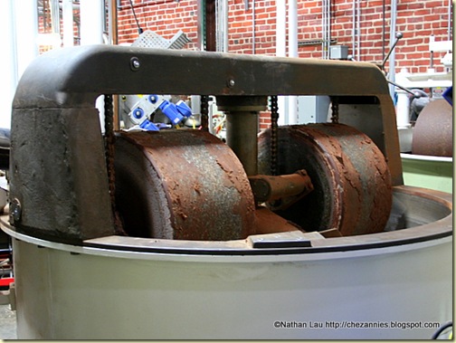 After the beans are roasted, they are put into the winnower where the roasted beans are cracked and the nibs at the heart of the bean are extracted. From there, they go into the melangeur to be crushed by these huge granite wheels: